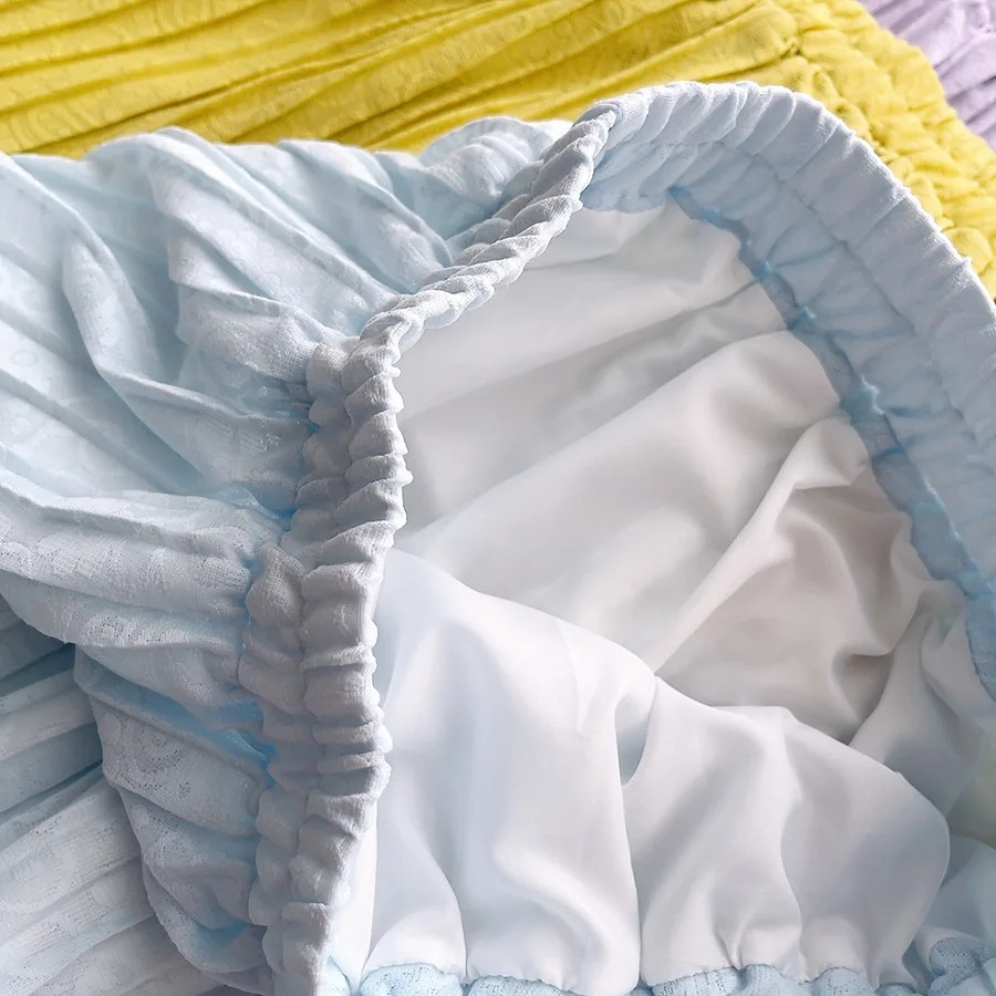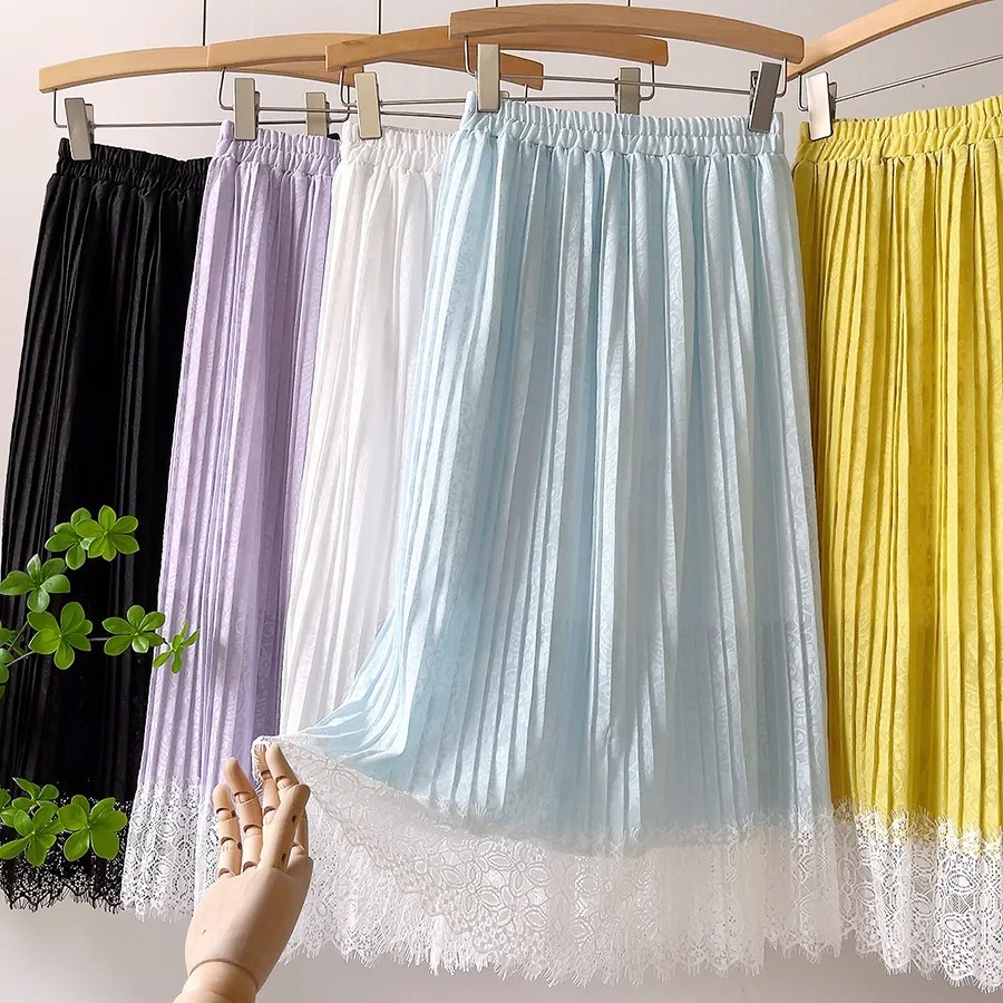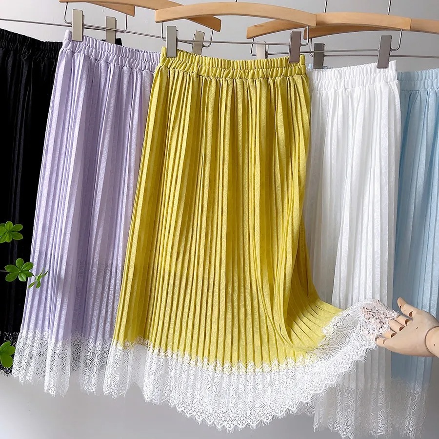 2022 Spring Women Skirts Lace Patchwork Pleated Skirts Sweet Solid Skirt Femme Elastic High Waist Elegant Skirt Women Streetwear