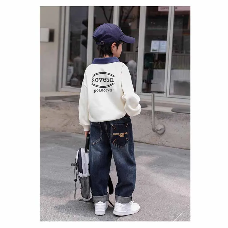 2024 Boys Fashion Jeans Children’s Loose Casual Pants Spring Autumn New Kids Elastic Waist Pocket Letter Trousers 5-14 Years Old