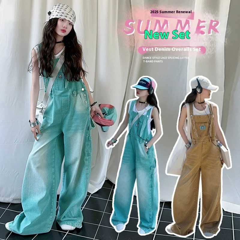 Denim Overalls for Girls Loose Slimming Casual Wide-Leg Jumpsuit 2025 Summer Kids Jeans Fashion Versatile Teen Children Pants