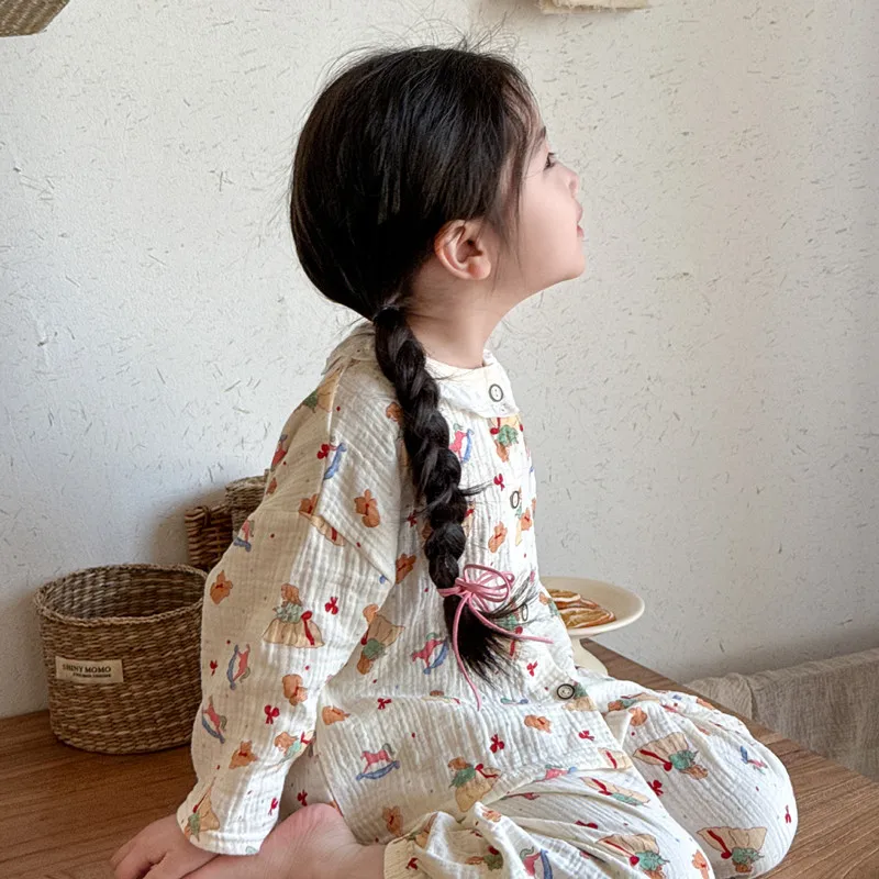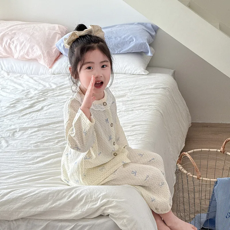 Girls Homewear Set Mom Daughter Family Matching Clothes Suit Lace Princess Pajama Muslin Cotton Outfit Baby Sleepwear Tops+Pants
