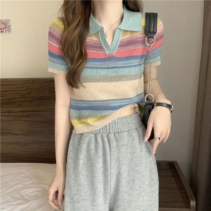 Ice Silk Knitted T-shirts Sexy Crop Top Pretty Short Sleeve Striped Women’s Polo Korean Popular Clothes Casual Lapel Female Tee