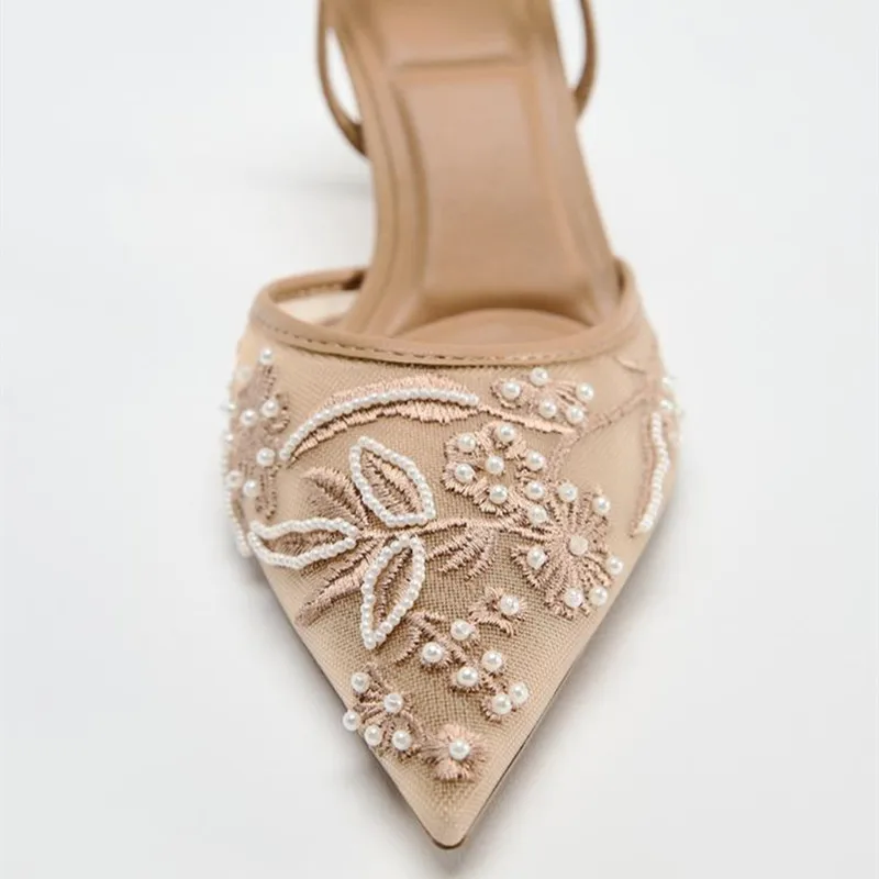 Luxury Mesh Embroidery High Heels Women Sexy Pointed Toe String Bead Slingback Heeled Sandals Summer Elegant Banquet Dress Shoes
