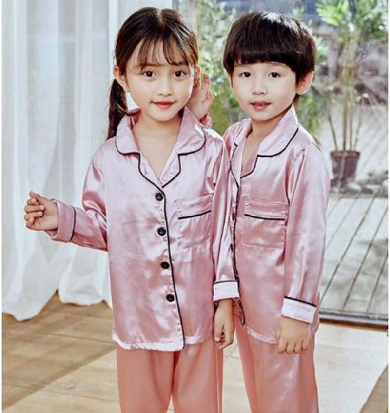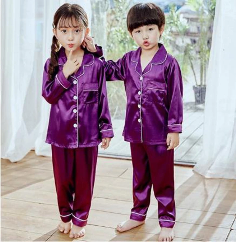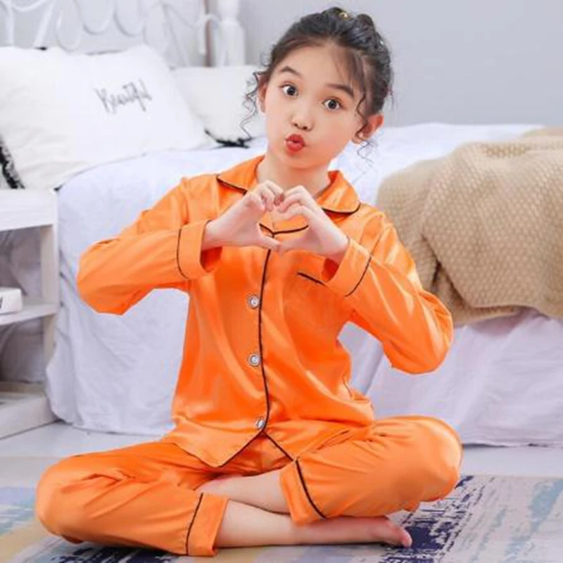 New Button-Down Spring Autumn Children Satin Pajamas Sets Kids Girls Solid Silk Long Sleeve 2 Pieces Tops+Pants Sleepwear Pyjama