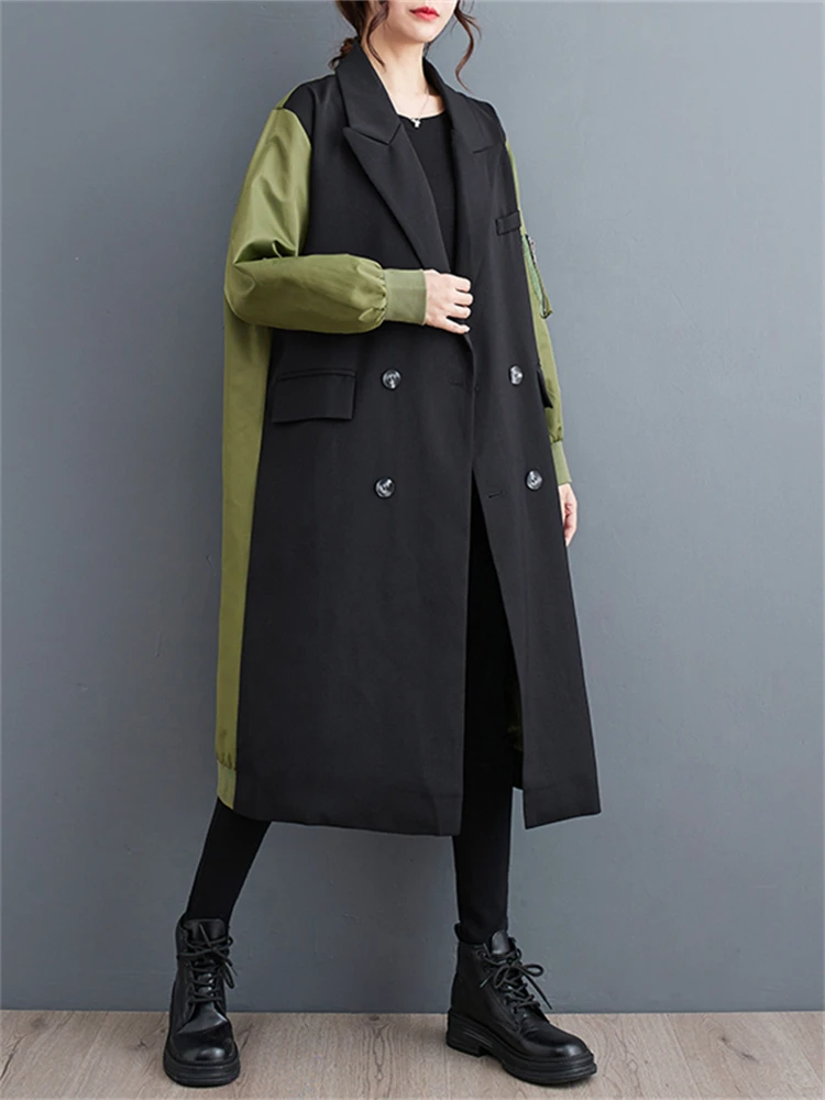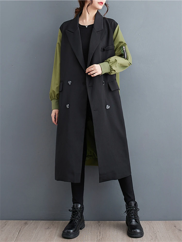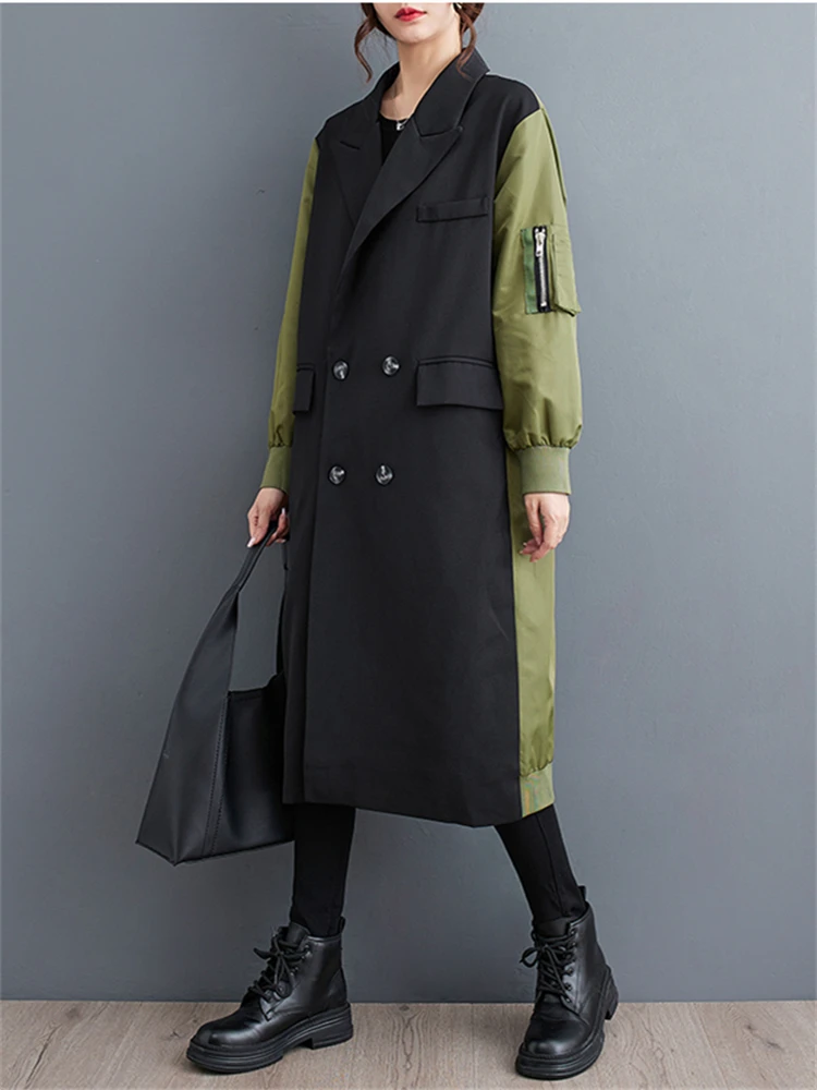 Oversized Turn-down Collar Trench Coat For Women 2024 Autumn Winter Casual Loose Vintage Patchwork Fashion Outerwear Cardigan