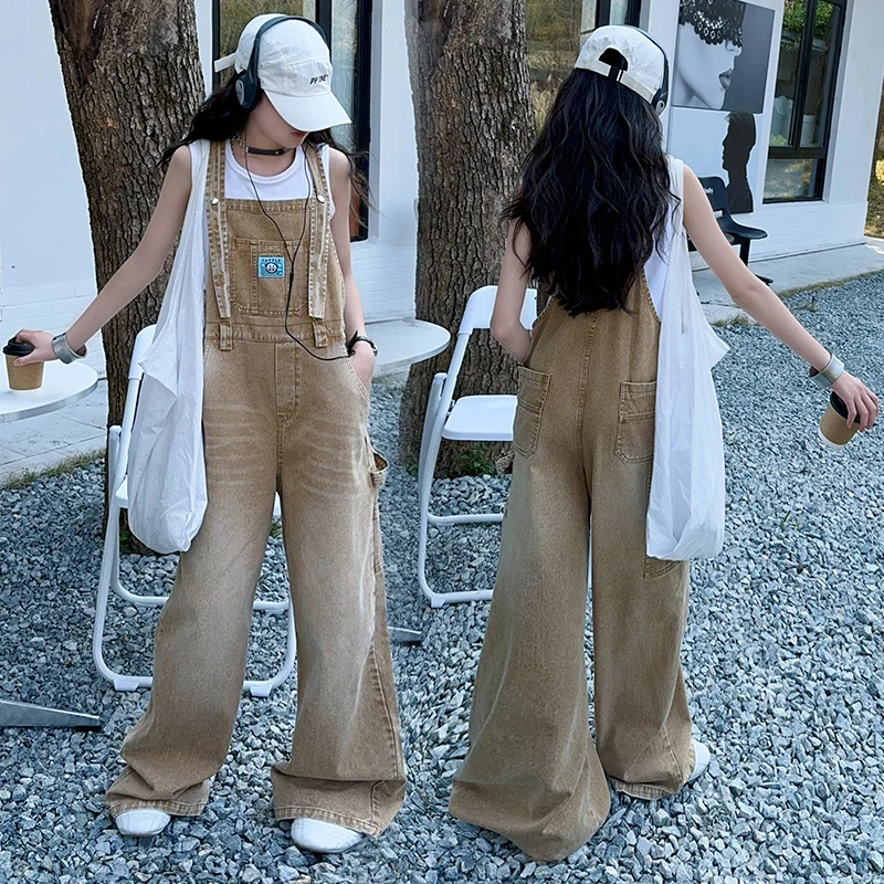 summer teen girls water washed punk wide leg jumpsuit junior kids loose slimming casual Cowboy overalls 4-14 child ropa trousers