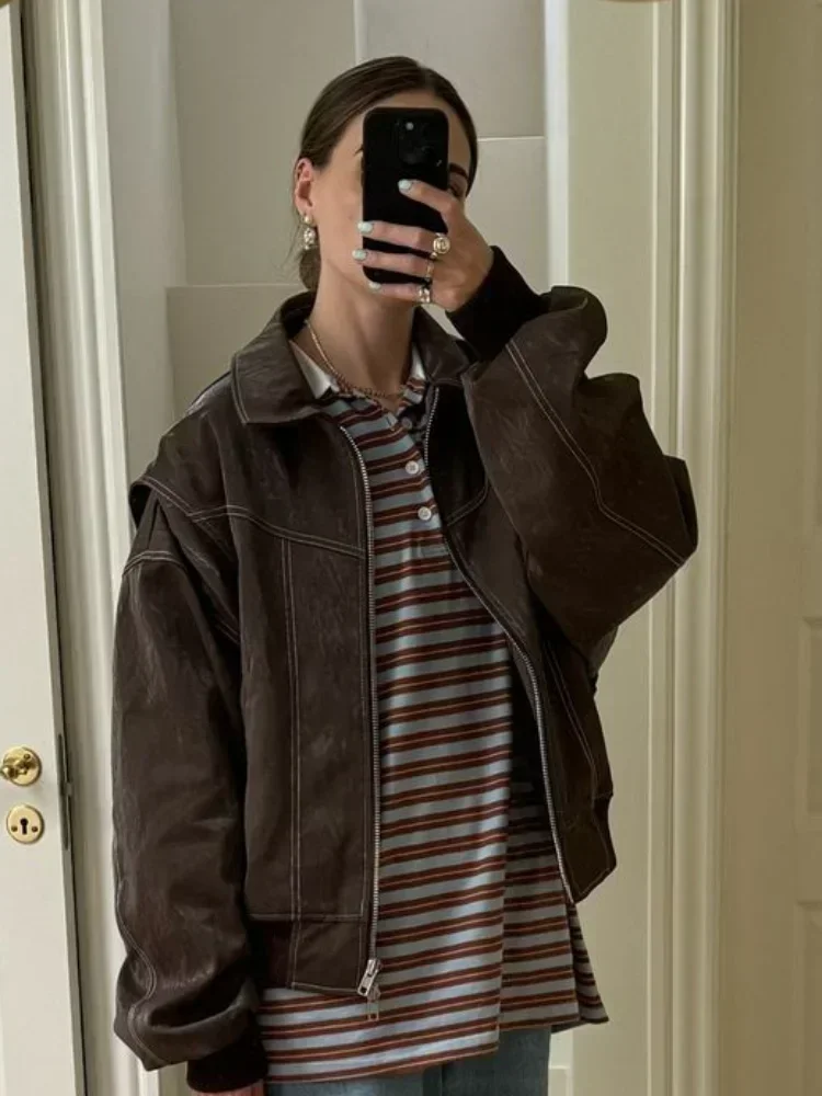 Vintage Solid Lapel Collar Zipper Women’s Leather Jacket Casual Fashion Lapel Long Sleeve Coat 2024 Autumn Winter Outwear Tops