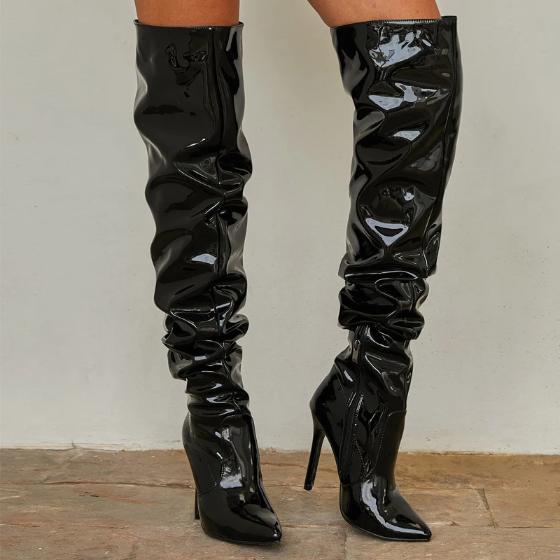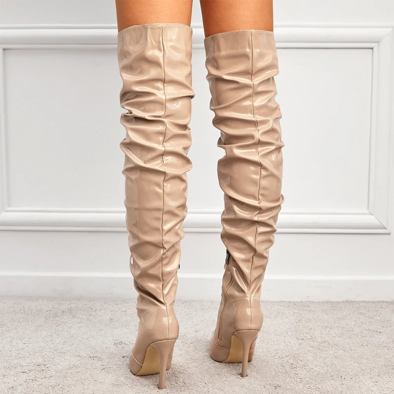 Winter Long Boots Woman Patent Leather Pointed Toe Stiletto High Heels Zipper Over The Knee Boots Botas Altas Sexy Ladies Shoes