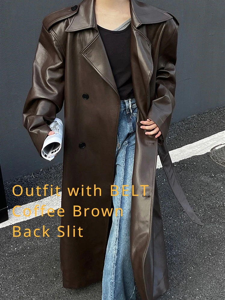 Women Leather Long Jacket Trench Oversized Faux Leather Blazer Button Down Lapel Coat with Pockets Down Shirts/Coats Work Office