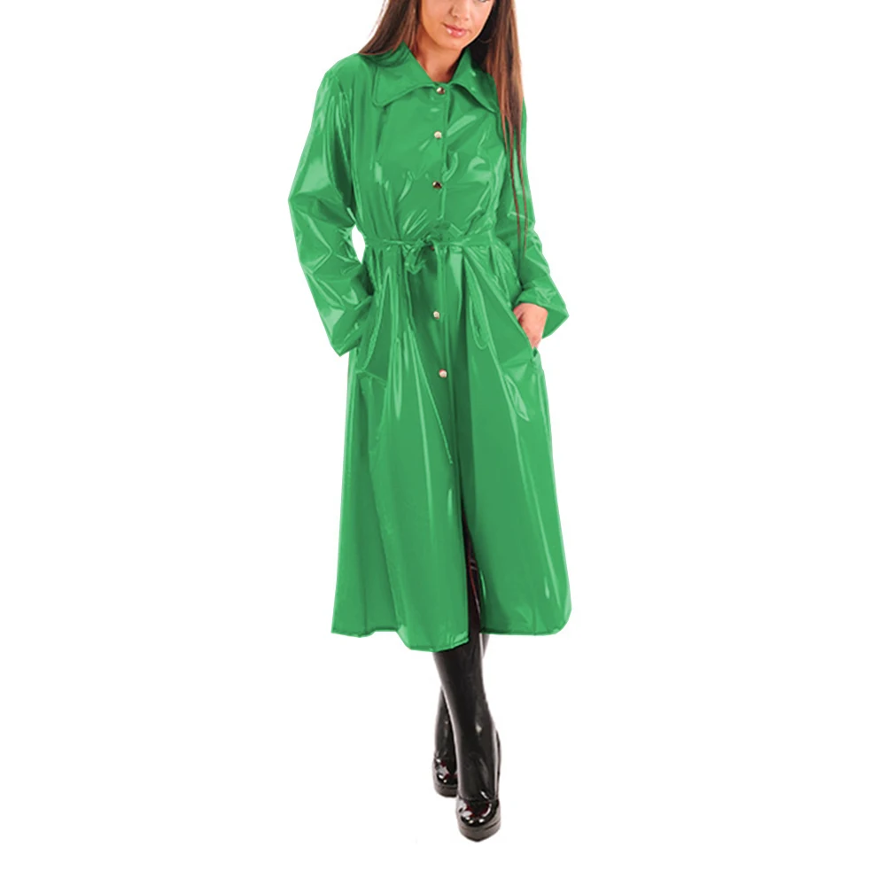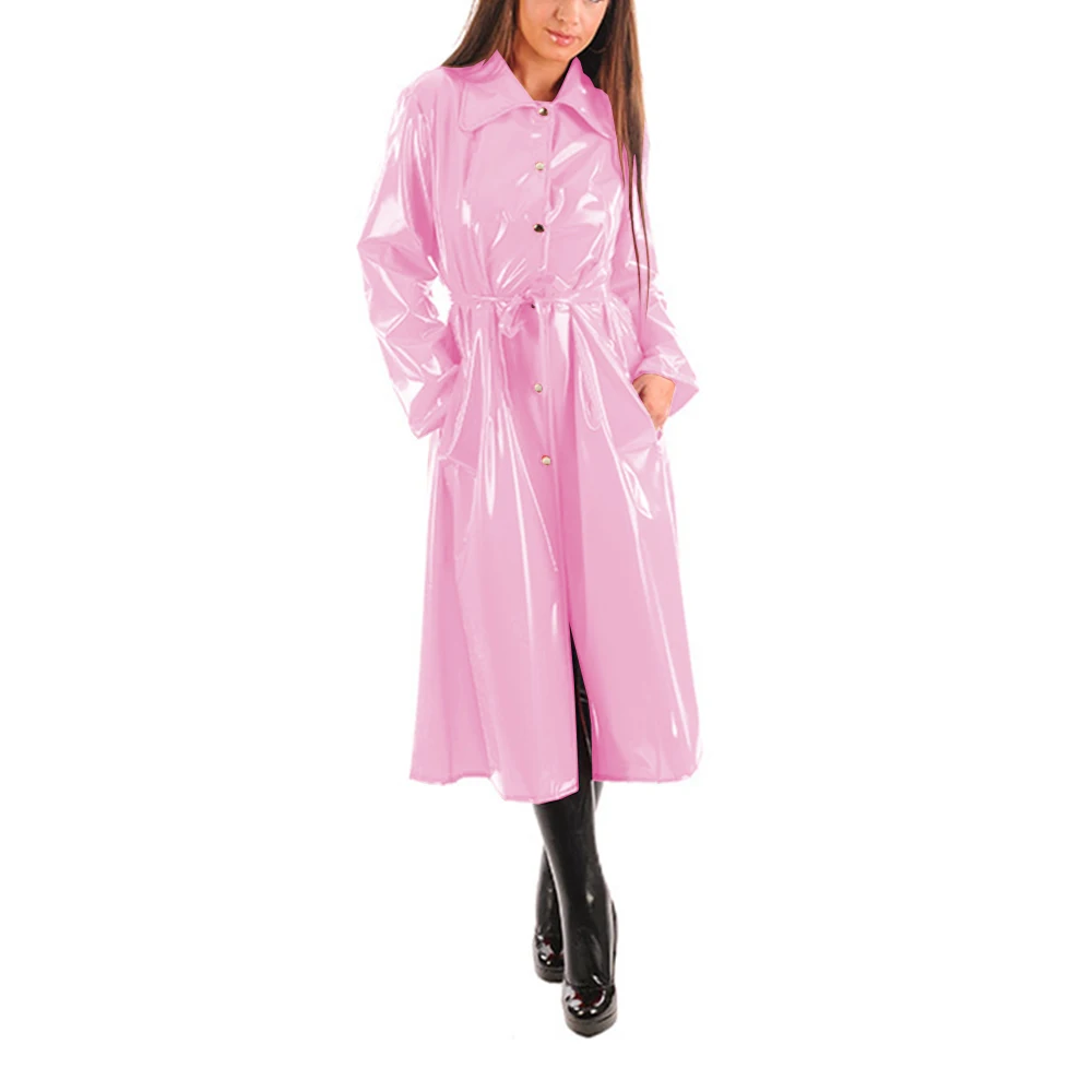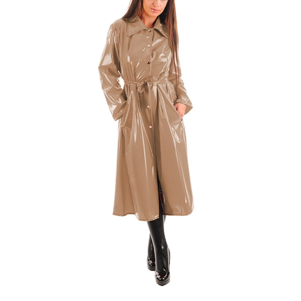 Women’s PU Leather Turn-Down Collar Midi Trench, Shiny Faux Leather, Button-Up, Long Sleeve Dress Coats with Belt, Sexy Wet Look